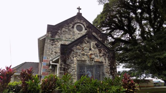 Die nur vorbeigekommen ist um uns mitzuteilen, dass die vorbeiführende Strasse ab 6h wegen des Triathlon-Radrennens gesperrt wird und wenn wir hier nicht bis zum späten Nachmittag ausharren wollen, dann müssten wir uns noch vor 6h auf den Weg machen. Wir packen zusammen, fahren nach Port Douglas, das wir sowieso noch anschauen wollen und müssen dort feststellen, dass das Radrennen hier seinen Umkehrpunkt hat, die einzige in den Ort führende Strasse sowie ein Großteil der Ortsmitte werden zwischen 7h und 17h für den Verkehr gesperrt. Nix wie weg und 20km weiter bis Mossman, dem nächsten größeren Ort, der neben dieser schönen alten Kirche