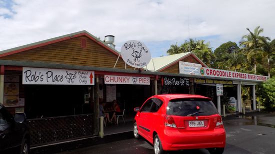 auch noch eine schöne Schlucht besitzt, zum einen zum Nationalpark erklärt, zum anderen aber auf dem Land der ‚traditionellen Landeigentümer‘ gelegen. Was macht man nun, wenn man gerne Landbetretungsgebühr verlangen möchte, das aber für einen NP nicht möglich ist? Richtig, man kassiert für Dienstleistung – hier wurde durch ein riesiges Besucherzentrum erst mal der Eingang ins Tal versperrt, die in Tal führende Strasse auf Busbreite reduziert, so dass die Benutzung zu Fuss nahezu unmöglich ist und schon kann man die Besucher für eine 2km lange Busfahrt um AUD 9,15 erleichtern, mit dem Trostpflaster, dass man den Bus beliebig oft benutzen kann. Wir sind heute um Busverweigerungsmodus, die Schlucht bleibt unbesehen. Wir fahren weiter ins Daintree Village, sinnvollerweise am Daintree River gelegen in dem sich zahlreiche Krokodile tummeln sollen. Die Haupteinnahmequelle hier somit Krokodilsuch-und Bewunderungsfahrten.