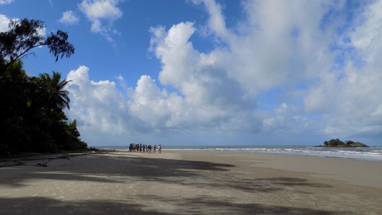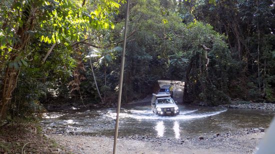 und Myall Beach, bevor wir endlich Cape Tribulation erreichen. Hier ist die Welt für normale Fahrzeuge zu Ende, ab hier geht es nur noch per 4WD weiter. Eigentlich wollten wir auf dem CREB Track quer über die Berge, aber da geht nur bei anhaltender Trockenheit, bereits der sporadische Nieselregen, den wir zur Zeit geniessen, verwandelt die Lehmstrecken in eine Mischung aus Schmierseife und Glatteis. Wir wählen gezwungenermaßen die zweitbeste Lösung, den Bloomfield Track, der uns neben einigen anspruchsvollen Wasserdurchfahrten