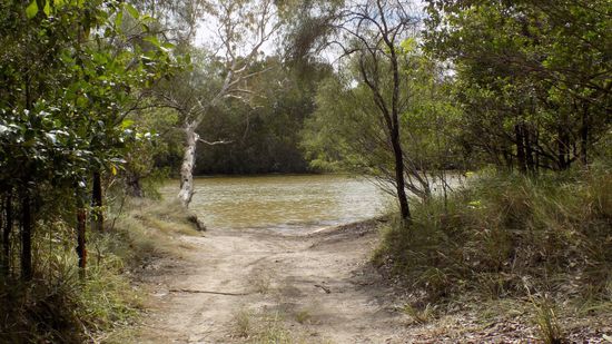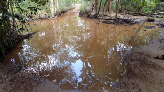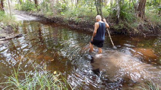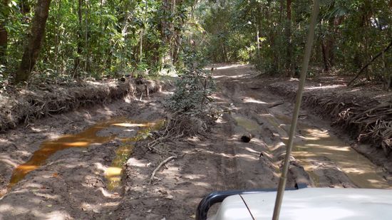 Wir stehen am Südufer des Jardine River, finden sogar im nahegelegenen Busch Campingplatz die alte Furt, die früher der einzige Weg über den Fluss war
