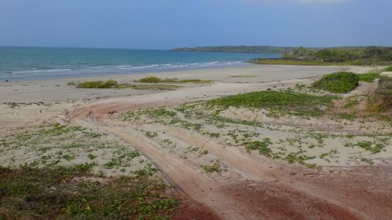 einer der Einstiege in den Track Nr. 33, der nun während der nächsten 4km direkt über 4 Strände führen würde - aber jetzt, bei auflaufender Flut absolut unmachbar. Wir kürzen ab, fahren direkt durch den Regenwald