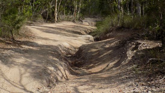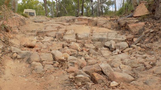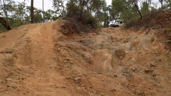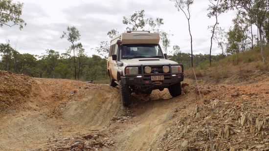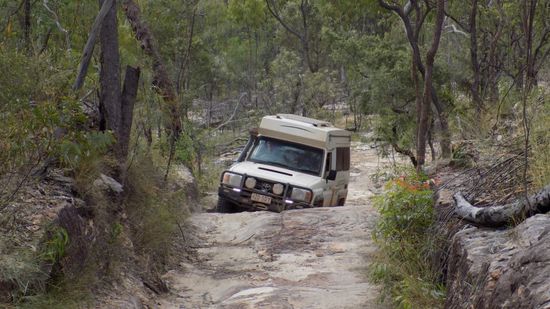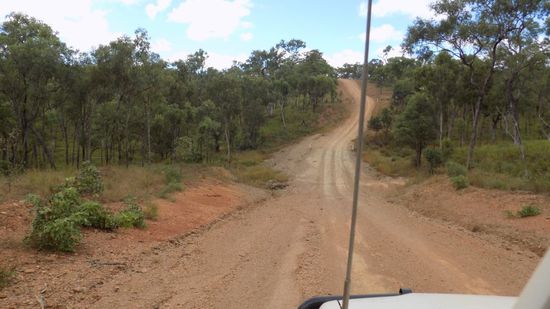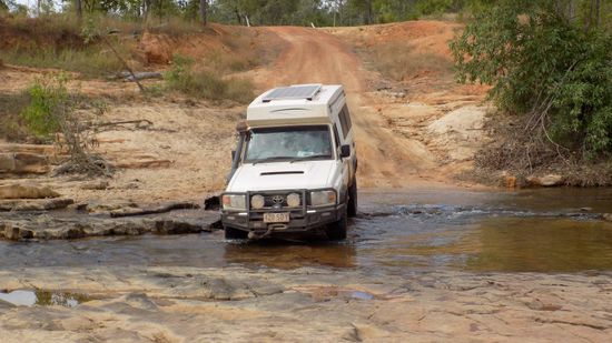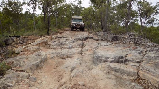 Kurz vor Laura, einst Eisenbahn – Endstation aus Cooktown, biegen wir auf die Old Coach Road ab, auf der einst die Goldsucher per Postkutsche die restlichen 80km nach Maytown in die Palmer River Goldfields geschafft wurden. Heute ist dies eine sehr anspruchsvolle 4WD Strecke, in unserem Buch als Track 28 bezeichnet. Das ganze fängt eigentlich sehr harmlos an, der Little Laura River, hier die erste Durchfahrt,