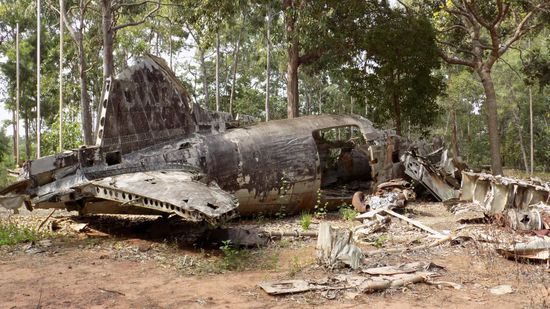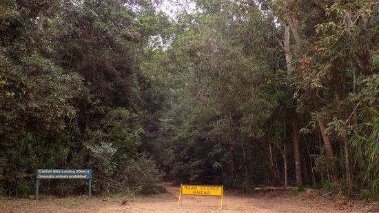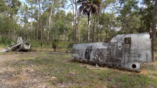 und einem Supermarkt. Wenige km weiter Bamaga (800 Ew.), der Hauptort der Halbinselspitze, aber auch hier ausser Supermarkt, Tankstelle und ein paar Werkstätten nichts Erwähnenswertes. Nahe des Flughafen von Bamaga, mitten im Wald dieses Wrack eines Bristol Bombers aus dem WW 2