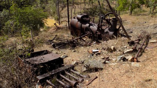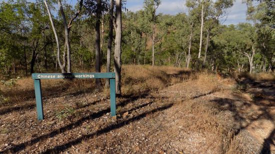 also einem Gebiet in dem chinesische Goldsucher einst mittels abgeleiteter Bäche nach an der Oberfläche gelegenem Gold schürften, ist nicht mehr viel zu sehen, dagegen sehen an der Louisa Mine and Battery, der alte Stampfer, der das goldhaltige Quarz zertrümmerte