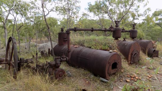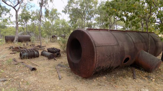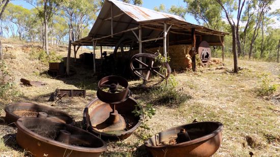 und auch der Besitzer war sofort zu einem kleinen Plausch bereit. In der nahegelegenen Comet Mill kann zum einen der größte Boiler dieses Goldfeldes bewundert werden, zum anderen diese relativ anzutreffenden seltenen berdan pans,