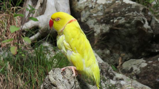 und dort dabei diesen handzahmen gelben Papagei mit seinem roten Halsring entdecken,