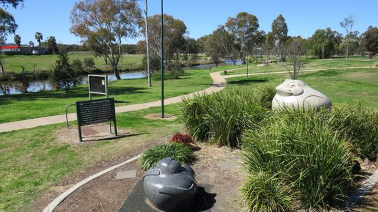 Die Nacht war bitterkalt (<5°?), umso mehr genossen wir die wärmenden Sonnenstrahlen bei unserem ausgedehnten Sonntagsfrühstück am nächsten Morgen. In Warwick dann ein erster Stopp am Rotary Park, bei diesen Kunstwerken drunten am Fluss,