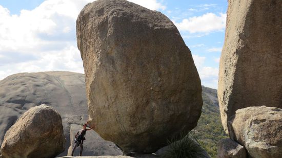 ein gut 230m hoher, blanker Granitklotz, der praktisch in der Direttissima begangen wird und seine Besucher am Gipfel droben mit diesem Wackelfelsen begrüßt.