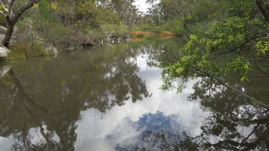 und der einst friedlich vorbeifließende Bach muss sich nun durch das Geröll quälen. Ein schnelles Foto vom direkt am Weg liegenden Dr. Roberts Waterhole,