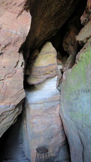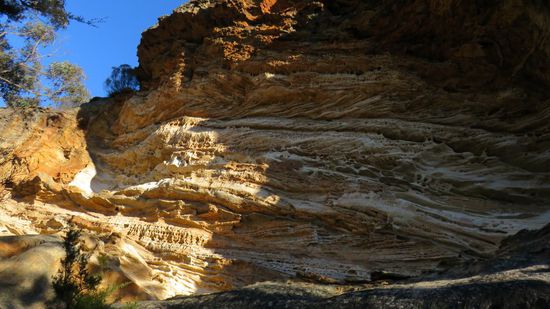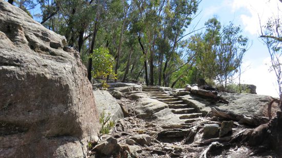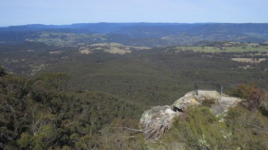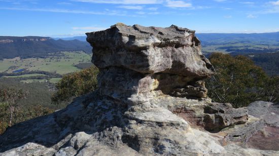 mit 1111m die höchste Erhebung der Blue Mountains und zugleich Standort des örtlichen Wasserreservoirs. Ein Stückweiter Blackheath, Rhododendronhauptstadt von NSW, doch für deren Blüte sind wir noch viel zu früh dran, biegen wir eben auf eine 10km Staubstrasse in den Blue Mountains NP ab, besuchen den Anvil Rock Lookout und die Wind Eroded Cave,