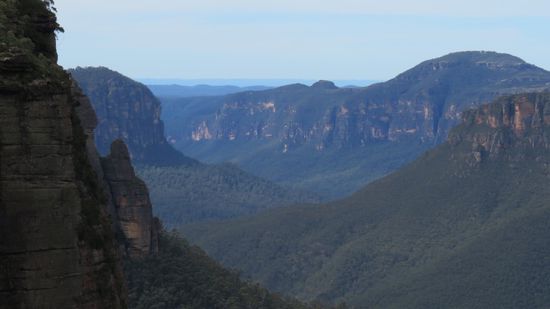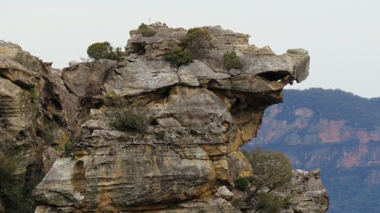 bevor wir nach Katoomba weiterfahren. Hier sind wir endlich am touristischen Gipfel dieser Region angekommen. Von Sydney aus in weniger als zwei Stunden per Zug oder Auto erreichbar, ist hier eben Tourismus satt. Wir fahren erst mal den Cliff Drive entlang, bestaunen am Cahills Lookout den Boars Head (Wildschweinschädel) Rock