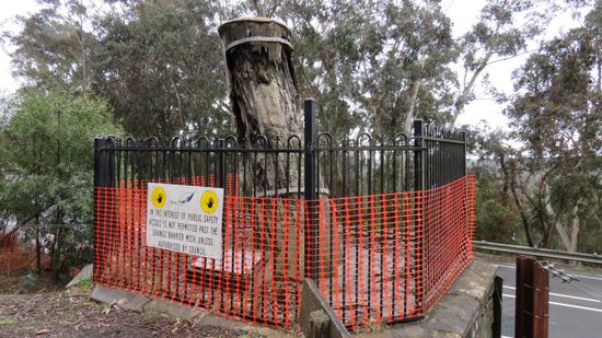 traurige Ruine eines Baumstumpfes, der bei der ersten Überquerung der Blue Mountains als Wegmarkierung dienen durfte. Wir wandern runter zu den Leura Cascades