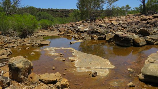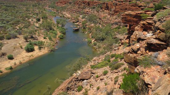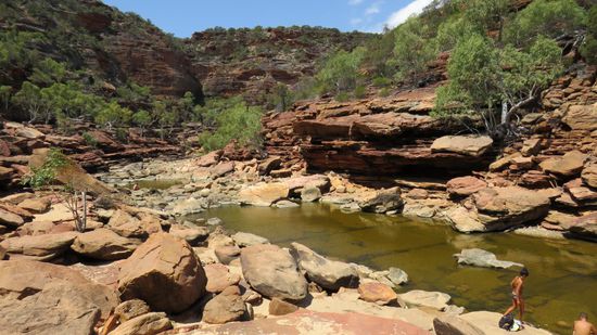 endlich drunten am Murchison River ankommt, wo gar manche(r) ein kühles Bad geniesst.