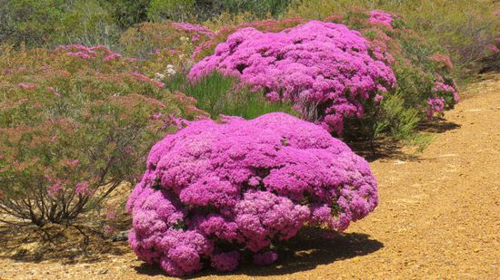 um einen ersten Blick auf den ‚mighty Murchison River‘ zu werfen, der hier, bereits 700km unterwegs und schon gute 10m breit, über 80km in den tollsten Mäandern sein Bett durch die Sand-und Kalksteinfelsen gegraben hat. Vorbei an solchen bunten Feldern mit Wild Blumen