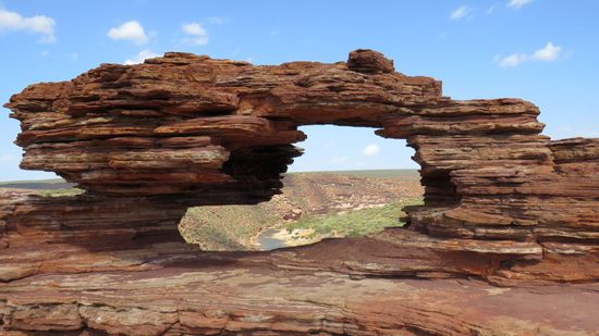 ein Loch in einem Felsen, durch das man (wenn man endlich an der Reihe ist) den Mighty River fotografieren kann. Wir durchqueren die RV unfreundliche Stadt Kalbarri