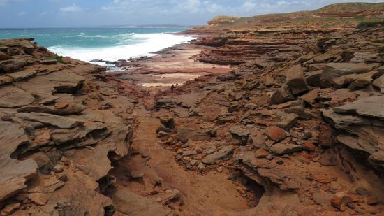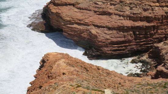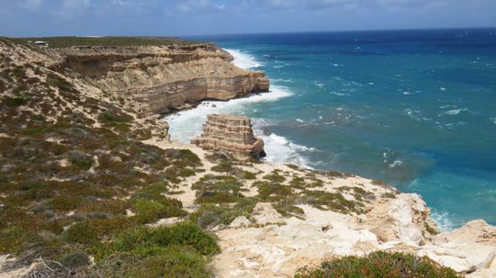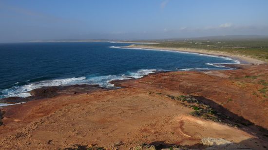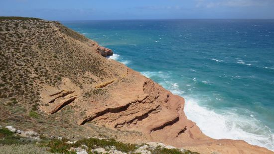 und fahren zur Küsten-Sektion des Kalbarri NP. Hier wurde auf etwa 20km die schöne Kliff – und Felsenküste unter den NP Schutz gestellt. Die Red Bluff, knallrote Sandsteinfelsen leuchten im Abendrot -