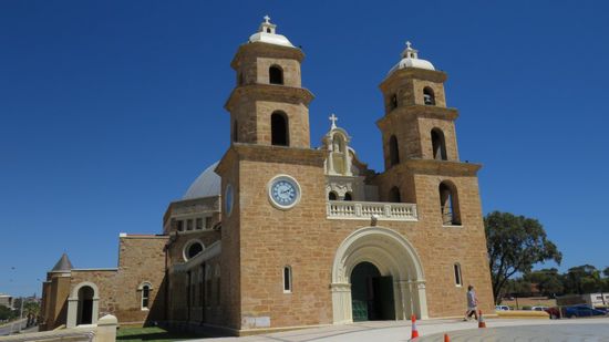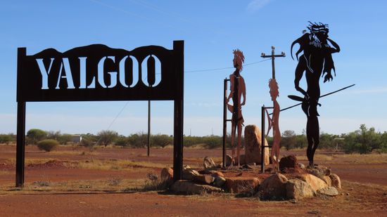 die John Hawes, Architekt der Kathedrale von Geraldton, während seiner Zeit als Priester hier sich selbst baute ist leider wegen Erkrankung des Führers verschlossen – Pech gehabt. Wir ersparen uns die nächsten 150km auf dem wahrscheinlich genau so interessanten Southern Loop und fahren gleich weiter über Pindar, 20 Ew. nach Yalgoo ca. 100Ew., das an allen 3 Ortseinfahrten seine (durchreisenden) Besucher mit solchen monumentalen Statuen begrüßt.
