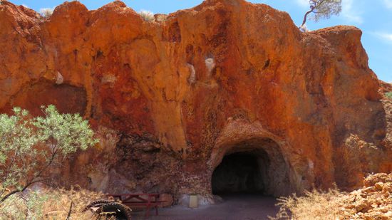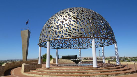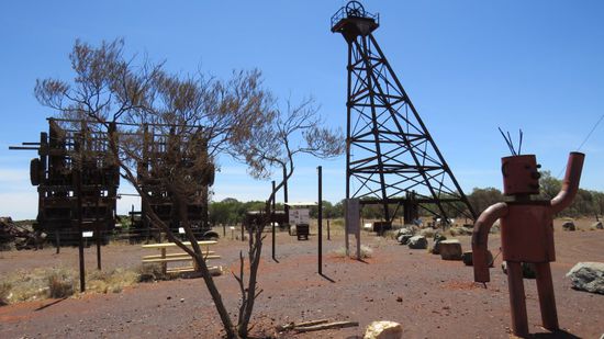 für die Arbeiter einer nahegelegenen Nickelmine auch Schulen, Kindergärten, Einkaufszentren eben die ganze Infrastruktur einer Kleinstadt umfasst. Wir fahren weiter Richtung Süden nach Leonora, werfen dort erst mal einen Blick von oben auf die Stadt, dann noch einen langen Blick nach unten in den Open Cut der Sons of Gwalia Mine,