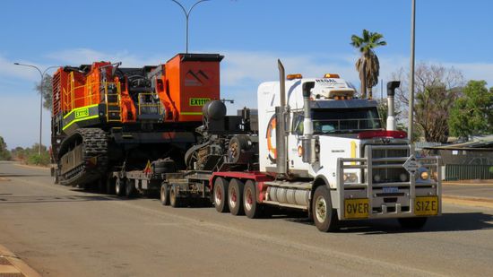 Nach 20km erreichen wir Mt. Magnet mitten im aktiven Goldabbaugebiet und müssen mal schnell diesem gut 2 Fahrspuren breiten Grubenmonster ausweichen, für dessen Umzug offensichtlich der verkehrsarme Sonntagsmorgen genutzt wird.