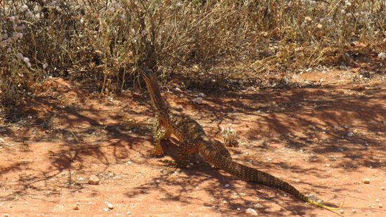 werden zurück auf der Hauptstrasse von diesem Goanna begrüßt