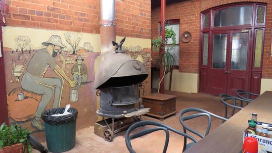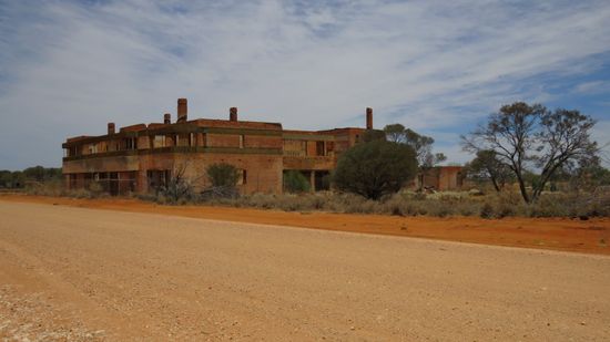 und erreichen Big Bell, bis um 1950 florierende Goldminenstadt, die aber nach Schliessung der Mine sehr schnell zur Geisterstadt verkam. Ausser ein paar Fundamenten von einstigen Häusern ist nur noch diese Hotelruine erhalten,