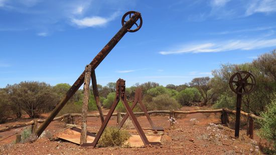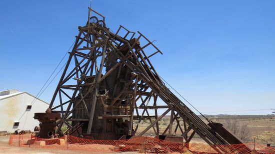die auch schon mal um 1890 ausgebeutet wurden und heute immer noch etwa 52g (=2 oz) Gold pro Tonne Gestein liefern. Droben am Grubenrand der alte Headframe (Schacht – Aufzug) aus den Tagen