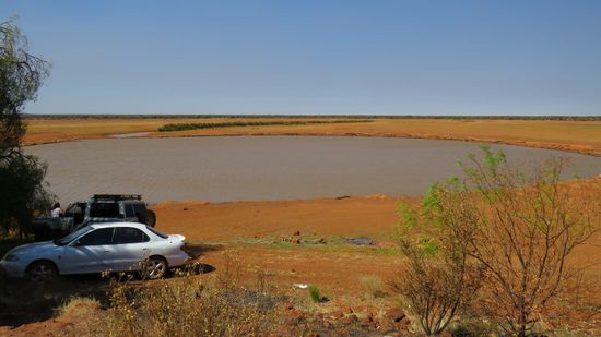nur noch ein bisschen Wasser im Wasserloch, das nicht mehr zum Schwimmen einlädt, am Murrin Murrin Lookout