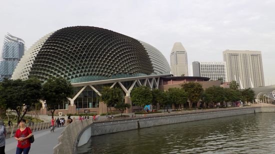 futuristisch anmutender Aussichtsplattform man einen schönen Überblick über den Singapur River hat (Fotografierverbot!!), gehen den Clarks Quay, der Partymeile von Singapur entlang,