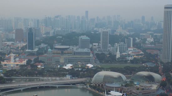 Wir gehen weiter zum Sands Hotel und Casino, fahren dort mit dem Aufzug in die Dachgartenbar im 57 Stock, geniessen von dort die Aussicht auf die Stadt und den darunterliegenden Skyway, die dem Publikum gegen Gebühr zugängliche Aussichtsterrasse,