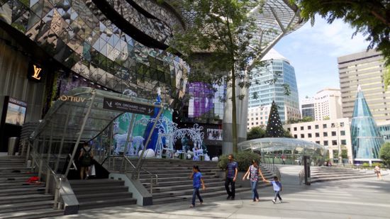 Den heutigen Tag verbringen wir mit dem Besuch, der Besichtigung der alten und vor allem der neuen Shopping Centers entlang der Orchard Road, einst DIE Einkaufsmeile von Singapur, heute trotz oder dank der Konkurrenz in der Bay Area immer noch eine sehr attraktive Strasse in der immer wieder einmal neue Einkaufspaläste entstehen. Der neueste hier, 2009 eröffnet, das ION überrascht durch seinen eigenwillig gestalteten Eingang,