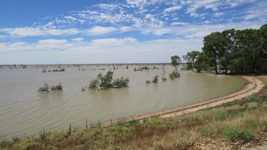 Wir kommen in den nächsten Bezirk hier, dem Lachlan Shire, Heart of Central NSW, in dem sich 7.200 Einwohner die stolze Fläche von gut 15.000 qkm teilen – d.h. 1 Ew auf 2qkm, also totale Einsamkeit, kilometerweites Niemandsland, wenn es hoch kommt, etwa 5 Fahrzeuge Gegenverkehr pro Tag. Wir fahren noch bis zum Lake Cargelligo