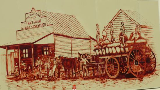 Ochsenkarren fährt sich im Schlamm fest, beim Versuch den Karren freizuziehen bricht die Deichsel, frustriert lässt sich der Gespannführer nieder um sich zu stärken und da sch… der Hund doch noch auf seine Tuckerbox. Um das ganze abzurunden wird diese Episode von Kollegen in Reime gefasst – und landesweit verteilt. Über das weitere Schicksal des Hundes ist uns nichts bekannt und warum direkt nebenan dieser Koala da rumsitzt wissen wir auch nicht.