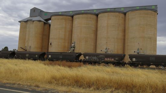 und fahren dann weiter über Land, sehen irgendwann diese Kornspeicher am Wegesrand, von denen aus ein Zug beladen wird,
