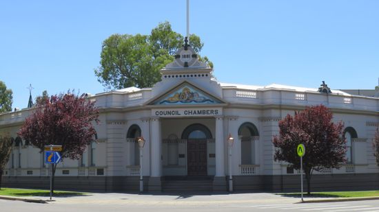 bevor wir nach Wagga Wagga weiterfahren, eine richtige Stadt mit um die 50.000 Ew., entsprechend dekorierter Council Chamber (Bezirksverwaltung)