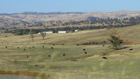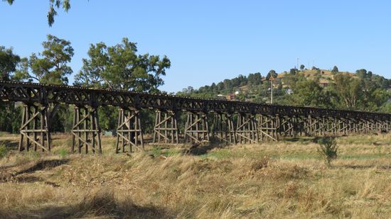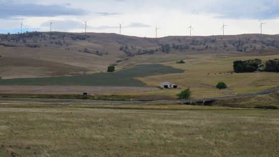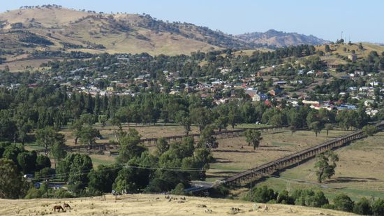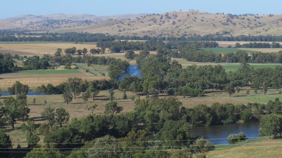 im Süden sind bereits die ersten Ausläufer der australischen Alpen zu erkennen, die Strasse entwickelt sich zur vierspurigen Autobahn, auf deren Seitenstreifen aber auch Radfahrer fahren dürfen und deren Grünstreifen so im km Abstand ganz legal überquert werden darf. In Gundagai fahren wir erst mal hoch auf den Rotary Lookout