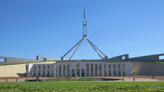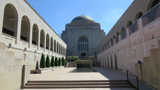 modernistisch kühl, im Innern mit reichlich Marmor verziert, gegenueber das alte Parlament House, heute Museum und Veranstaltungshalle und im Hintergrund in direkter Fluchtlinie das Kriegsdenkmal, das an die Gefallenen all der Kriege seit 1800 erinnern soll.