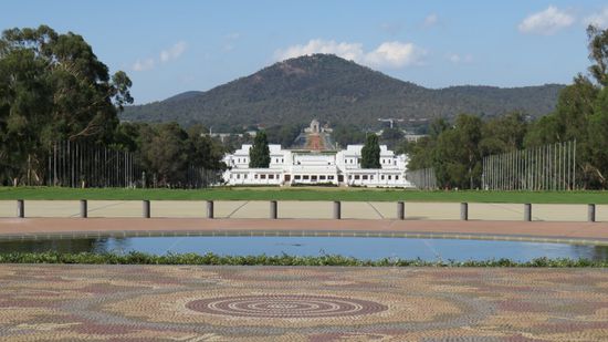 das wie der Henkel eines Bügeleisens wirkt. Droben auf einem Hügel das neue Parlament House,
