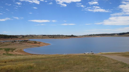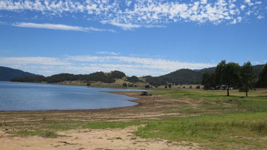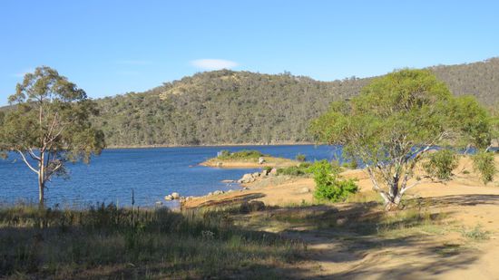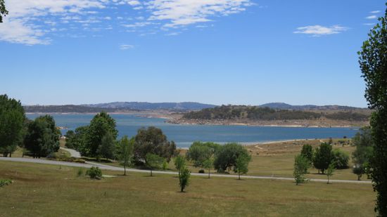 und ist doch nichts weiter als eine ‚Wohnsiedlung‘ für die Angestellten des Kraftwerkebetreibers. Wohnhäuser, Kantine, ein kleiner Laden, Tankautomat, das war‘s dann auch schon. Fremde dürfen tagsüber gerne mal vorbeischauen, Einkaufen, Tanken, aber Fremdenzimmer / Campingplatz = Fehlanzeige. Der weitere Weg führt uns am schön gelegenen Tumut Pond Reservoir vorbei,