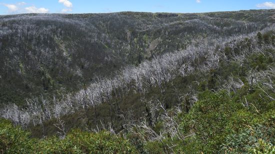 durch Gebiete in denen vor 10 bis 15 Jahren ein riesiger Waldbrand tobte. Die Mountain Ash (Eschen??) stehen immer noch dürr, verbrannt herum,