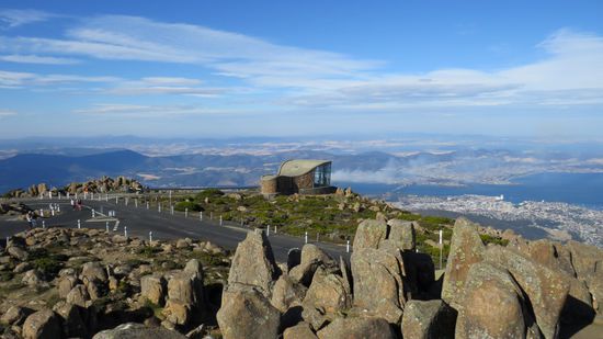 so kann man verstehen, dass es hier wohl wichtigeres zu tun gibt, als Landkarten von Blow- in Sink-Hole ändern zu lassen. Wir fahren auf einer gut ausgebauten Bergstrasse hoch bis auf 1270m zum Mt. Wellington Lookout,