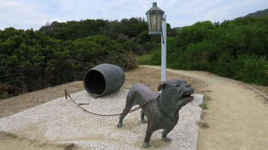 Wir fahren bis zum Eaglehawk Neck, einer wenige 100m langen und knapp 100m breiten Engstelle, die den nördlichen Teil der Halbinsel mit dem südlichen Teil verbindet. Um 1830 wurde hier ein tiefer, breiter Graben gezogen, mit weissen Muschelschalen gefüllt und dann der Grabenrand mit Lampen und aggressiven Wachhunden dekoriert – schon hatte man den perfekten Schutzwall zur Trennung der beiden Inselteile (da werden doch Erinnerungen wach,…), der Norden der Insel, der Rest Tasmaniens war sicher vor den auf dem Südteil der Insel kasernierten Sträflingen – und für die treuen Wächter wurde natürlich ein entsprechendes Denkmal aufgestellt.