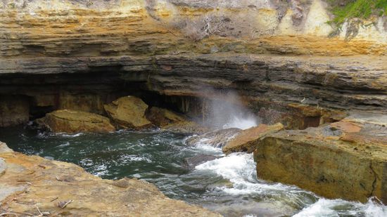 Hier ist etwas, das zwar mächtig spritzt – und trotzdem bei näherer Betrachtung kein echtes Blowhole ist. Hier finden wir eine enge Schlucht, einen kleinen Canyon, in den das Meerwasser gepresst wird