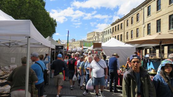 Heute geht es zurück nach Hobart, auf den Salamanca Samstags Markt. Jeden Samstag wird hier von 8:30 bis 15:00 an über 300 Verkaufsständen eine bunte Mischung aus Kunsthandwerk, Gemüse, Obst, Wein, Spirituosen, natürlich Naschwerk und Feinkost, kurz Leckereien aller Art angeboten.