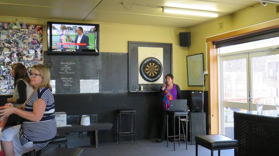 das in seinem Hinterhof einen riesigen, kostenlosen Stellplatz für WoMo‘s bereitstellt. Für uns leider noch etwas zu früh, über Orford fahren wir noch bis Triabunna, wo wir im Hinterhof des Spring Bay Pub Hotel unsren heutigen SP beziehen und zur Geschäftsankurblung noch kurz auf ‚ein Dunkles‘ die modernistische Bar besuchen,