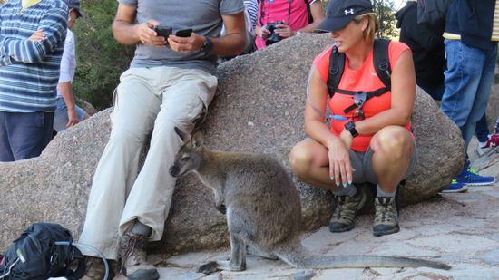 Nur wurde auch hier wieder einmal vor den Erfolg die Geduld und der Schweiss gesetzt. Der Versuch den Besucherparkplatz nach 9:00 zu erreichen kann oft in guten 2 Stunden Stau und Warteschlangen enden – und einen ersten Blick vom Lookout auf diesen herrlichen Strand kann nur der werfen, der in gut 1h schon mal 175Hm bis zur Passhöhe hochgestiegen ist. Droben am Lookout dieses werden die Besucher von diesem unscheuen Wallaby begrüßt