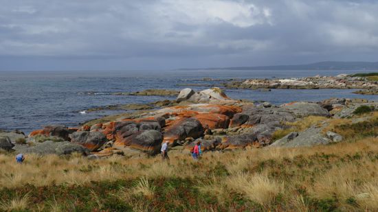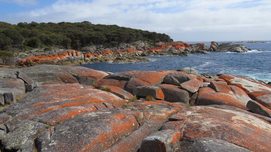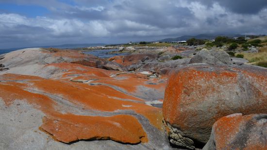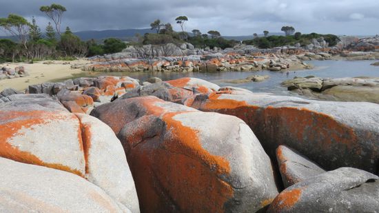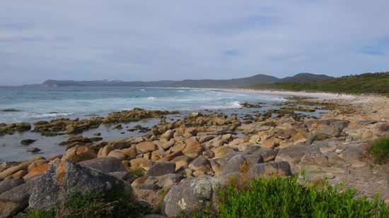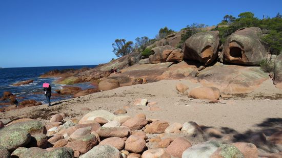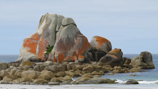 Wir sind in der Bay of Fires angekommen, einst so benannt, da ähnlich wie in Feuerland (Patagonien) die ersten Seefahrer hier entlang des Ufers (Lager?-)Feuer der Ureinwohner brennen sahen, wobei die roten Flechten auf den Granitfelsen am Ufer wie hier bei Grants Point