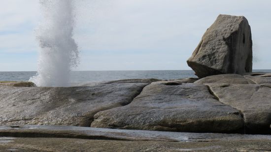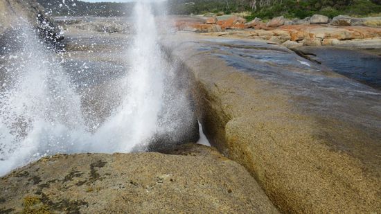 die laut Beschreibung zwischen 5 Min und 5 Stunden dauern kann. Wir fahren weiter zum Bicheno Blowhole und werden sofort stutzig, ein Blowhole in Granit, wie kann das sein?