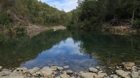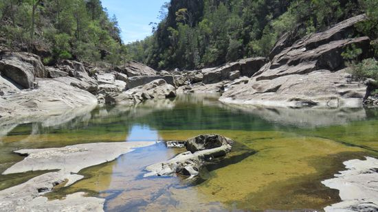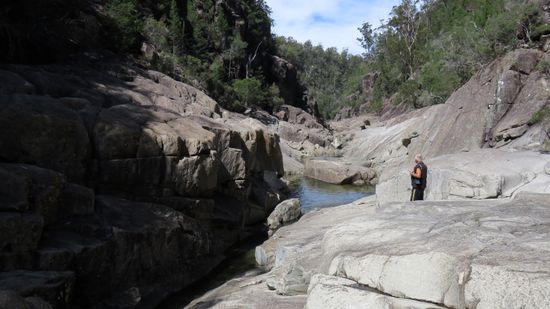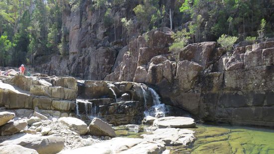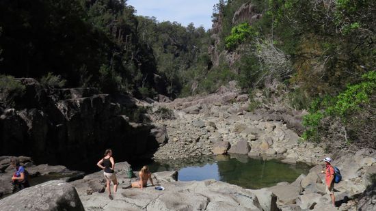 und beim Auftreffen auf die Rückwand mächtig in die Höhe spritzt. Die restlichen Touristen hier sind begeistert, wir fahren weiter in den Douglas Apsley NP, wandern auf Kurzwanderweg Nr. 52 erst bis zum Waterhole,