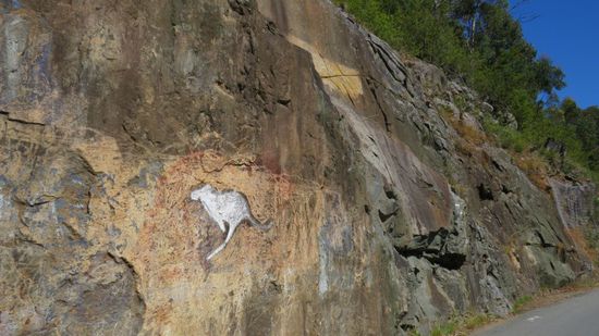 und noch ein weiteres Hinweisschild, das uns die Geschichte von einem weissen Känguru erzählt, das hier in den 50er Jahren angeblich dann und wann gesichtet wurde. Irgendwann haben dann ein paar ‚jugendlich gebliebene‘ ein weisses Känguru auf einen Felsen hier am Pass gemalt – und dieses Kunstwerk wird seither regelmäßig ‚aufgefrischt‘ – und auch wir haben keine Mühen gescheut (=2 Mal wenden auf einer engen Passstraße) um Euch liebe Leser White Skippy näherzubringen.