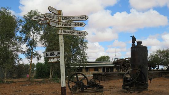Zurück auf dem Oodnadatta Track sind es gerade noch mal 7km bis William Creek, 12 Ew., im Historischen Park dieser rustikale Wegweiser in die Heimat